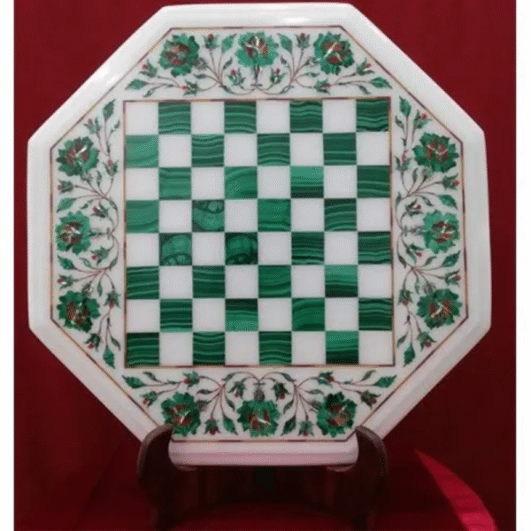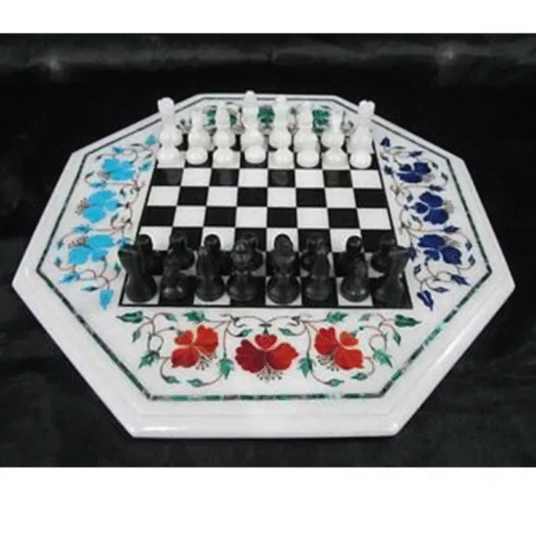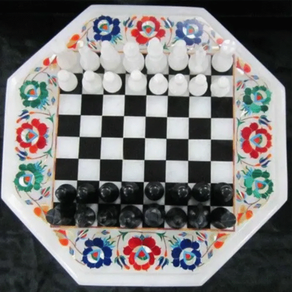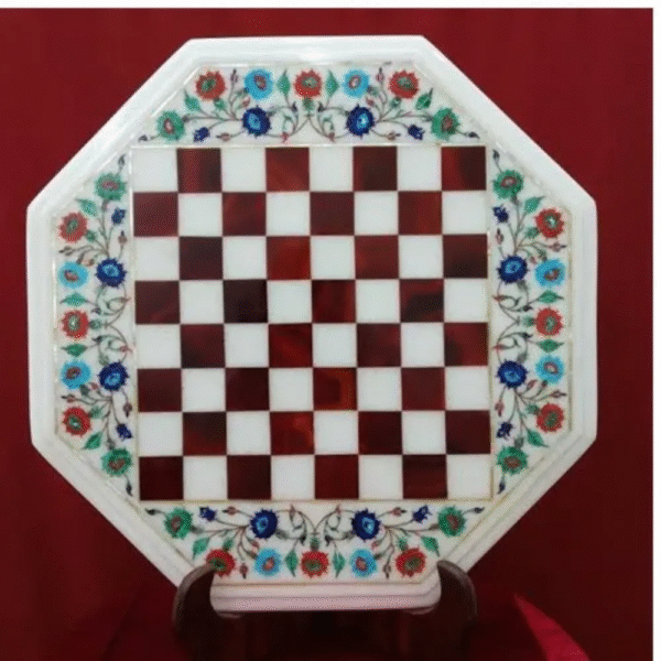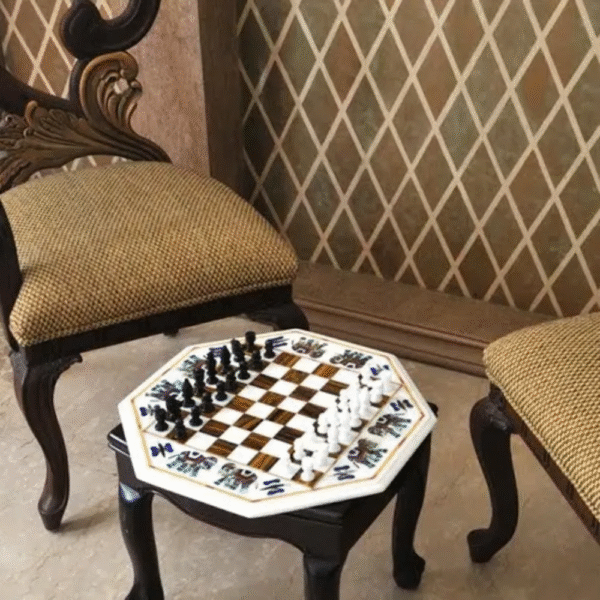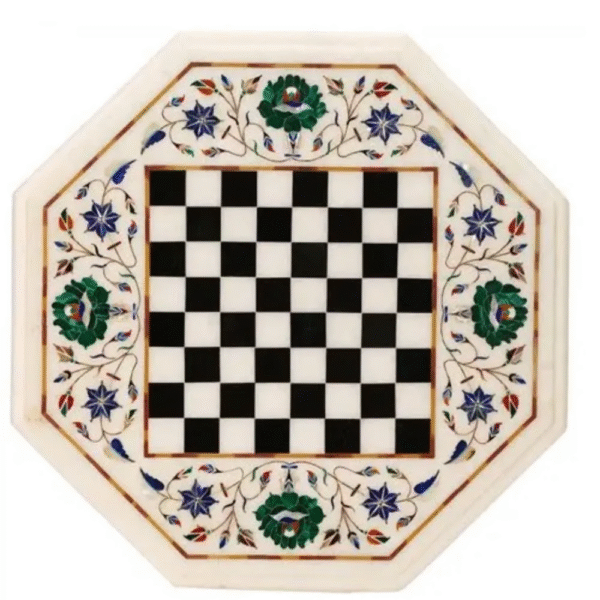 A beautifully handcrafted 20-inch octagonal marble chess board with intricate Mughal inlay work—perfect as a luxury décor piece and a premium gaming experience.