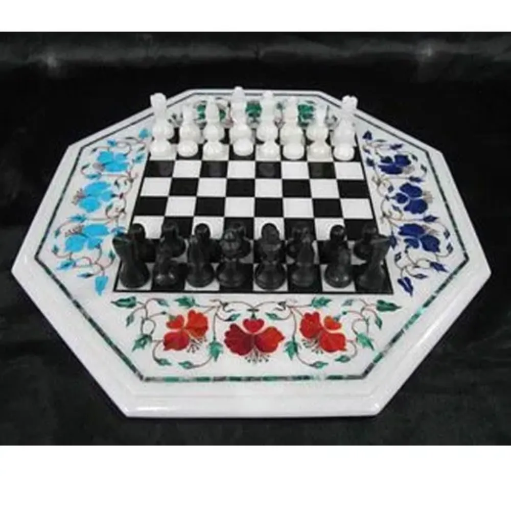 Experience the elegance of traditional craftsmanship with this White Marble Inlay Chess Board, designed in a stunning 20-inch octagonal shape. Made from high-grade marble and decorated with detailed Mughal inlay art, this chess set adds a touch of royalty to any home, office, or living space.