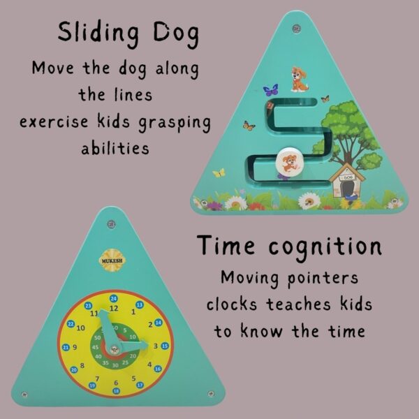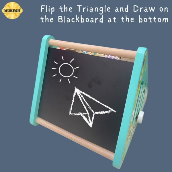 The rotating blocks, movable sliders, and chalkboard encourage independent play and creativity. Whether your child is learning to recognize alphabets, practicing counting, or exploring time-reading, this activity triangle offers hours of meaningful learning and play.