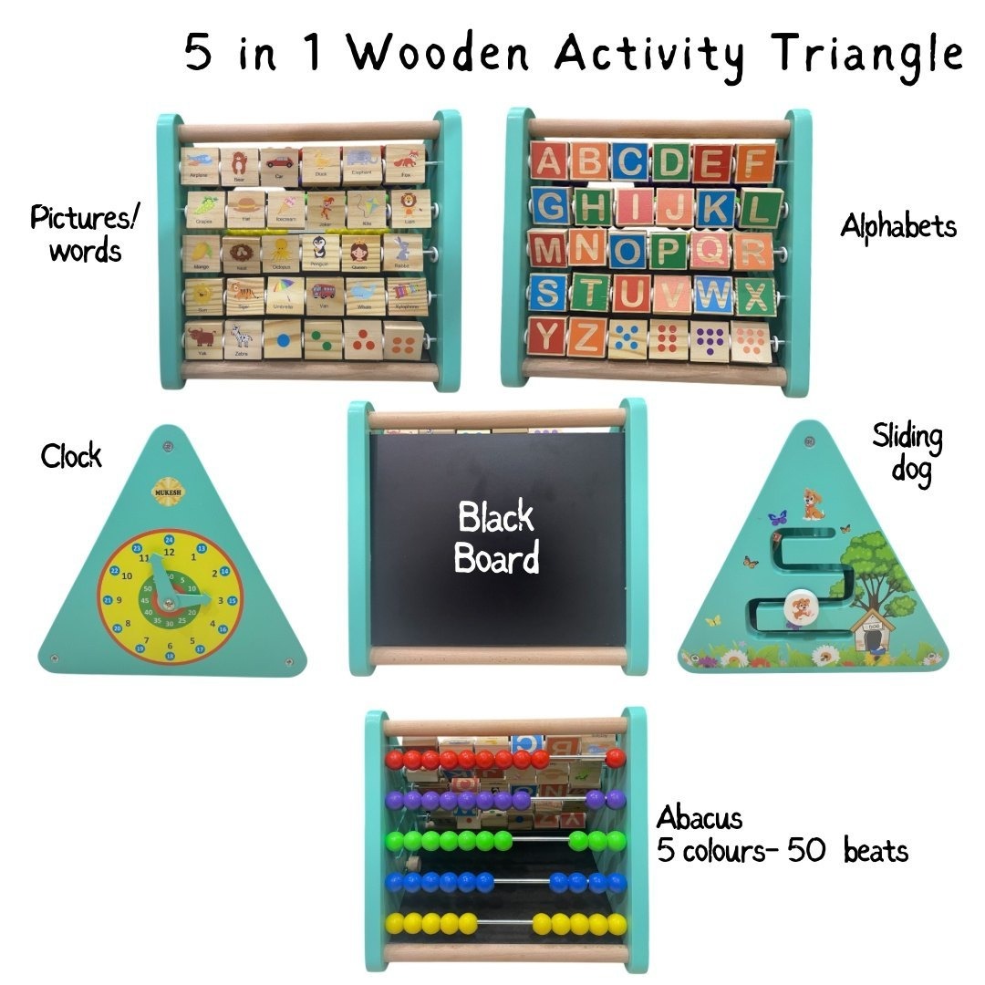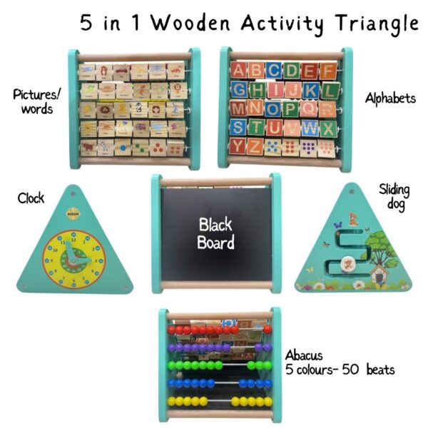 Introduce your child to fun early learning with this beautifully crafted 5-in-1 Wooden Activity Triangle. Designed to boost essential skills, this educational toy combines alphabets, pictures, an abacus, a functional clock, a blackboard, and a sliding game—all in one compact triangular frame.