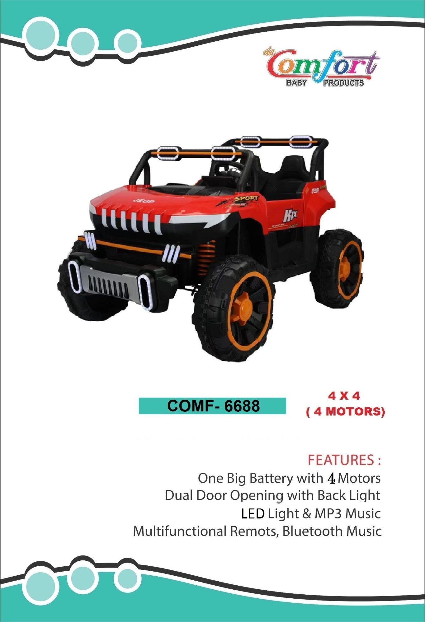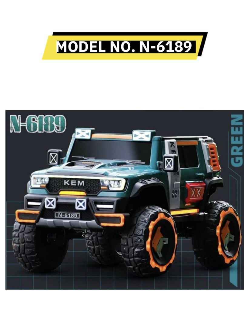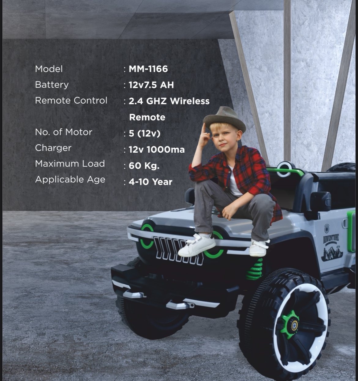 A rugged 12V off-road Jeep with 4 motors, dual doors, LED lights, and music features—built for adventurous kids.
